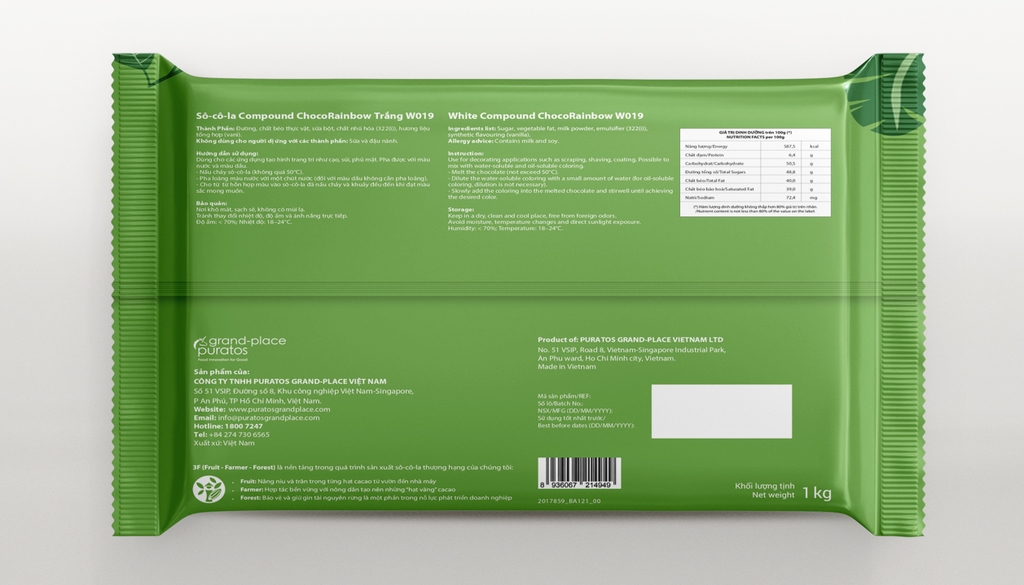 • Socola trắng cầu vòng W019 mang tính đột phá, với đặc điểm nổi bật là pha được màu nước và các loại màu khác. Những viên kẹo socola nhiều màu sắc sẽ cực kỳ đơn giản khi bạn dùng nguyên liệu socola cầu vồng với khả năng pha màu lên tới 2.5% đối với màu nước.